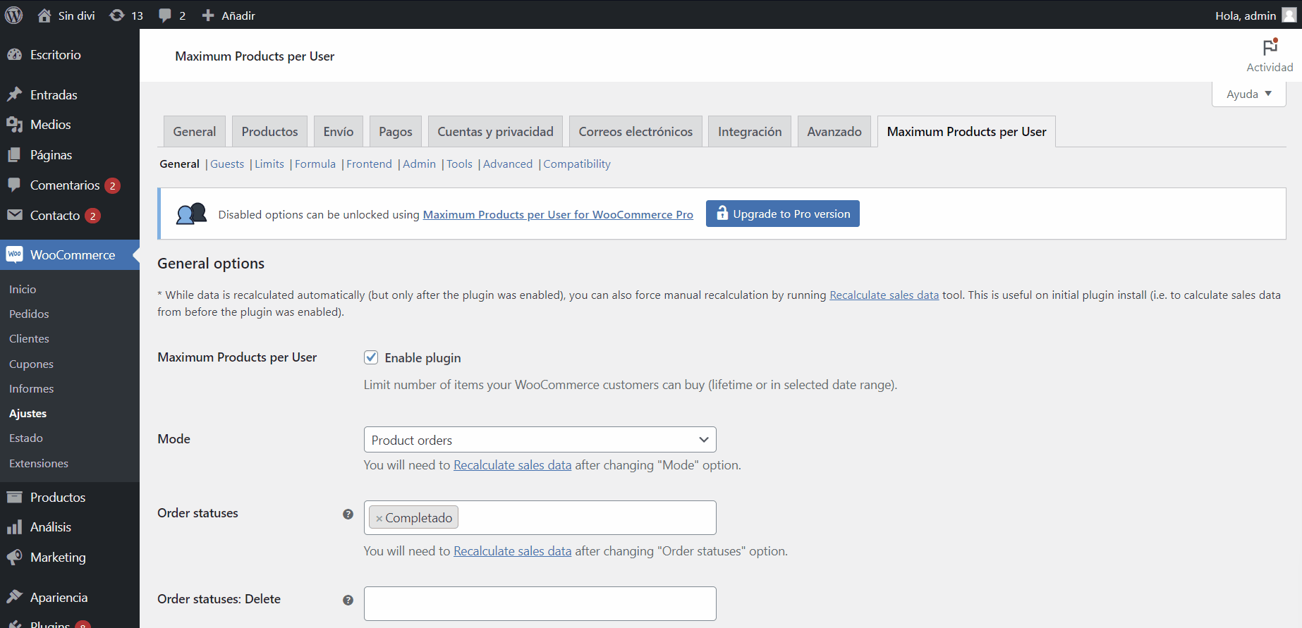 Una vez que tengamos instalado y activado el plugin, es hora de configurarlo, para ello debemos ingresar a WooCommerce > Ajustes en nuestro dashboard WordPress, luego de esto hacemos clic en la pestaña Máximo de productos por usuario, esta se incorporó para separar los productos y ser más sencillo de encontrar.