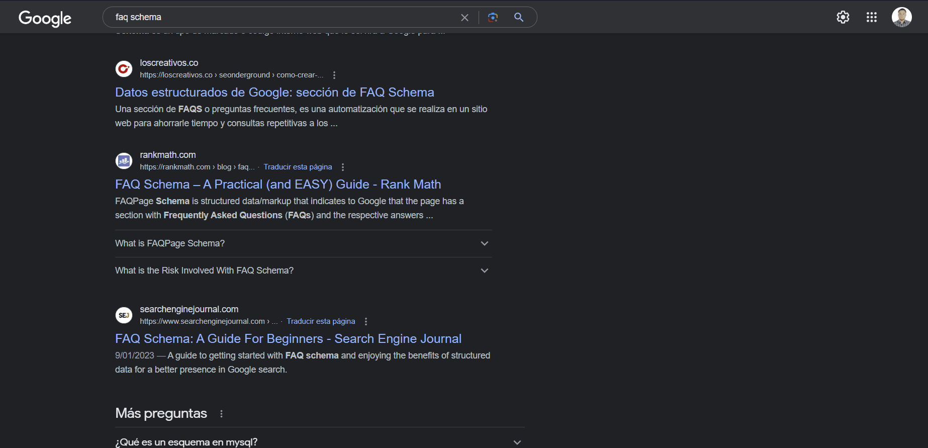 Visibilidad aumentada en las SERPs: al implementar el FAQ Schema, los resultados en Google pueden expandirse para mostrar las preguntas frecuentes. Esto no solo hace que nuestra entrada en los resultados sea más grande y, por lo tanto, más llamativa, sino que también puede responder con rapidez a las consultas de los usuarios, generando confianza y autoridad.