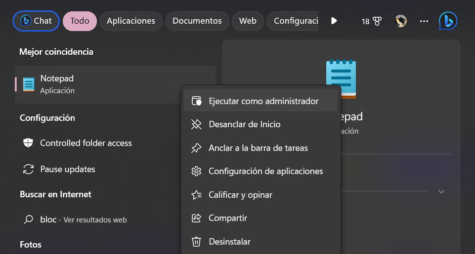 Para esto podemos hacer uso del buscador de Windows y escribir bloc de notas, una vez nos muestra el icono hacemos clic derecho seguido de ejecutar como administrador. Esto nos permitirá abrir el programa con los derechos que necesitamos.