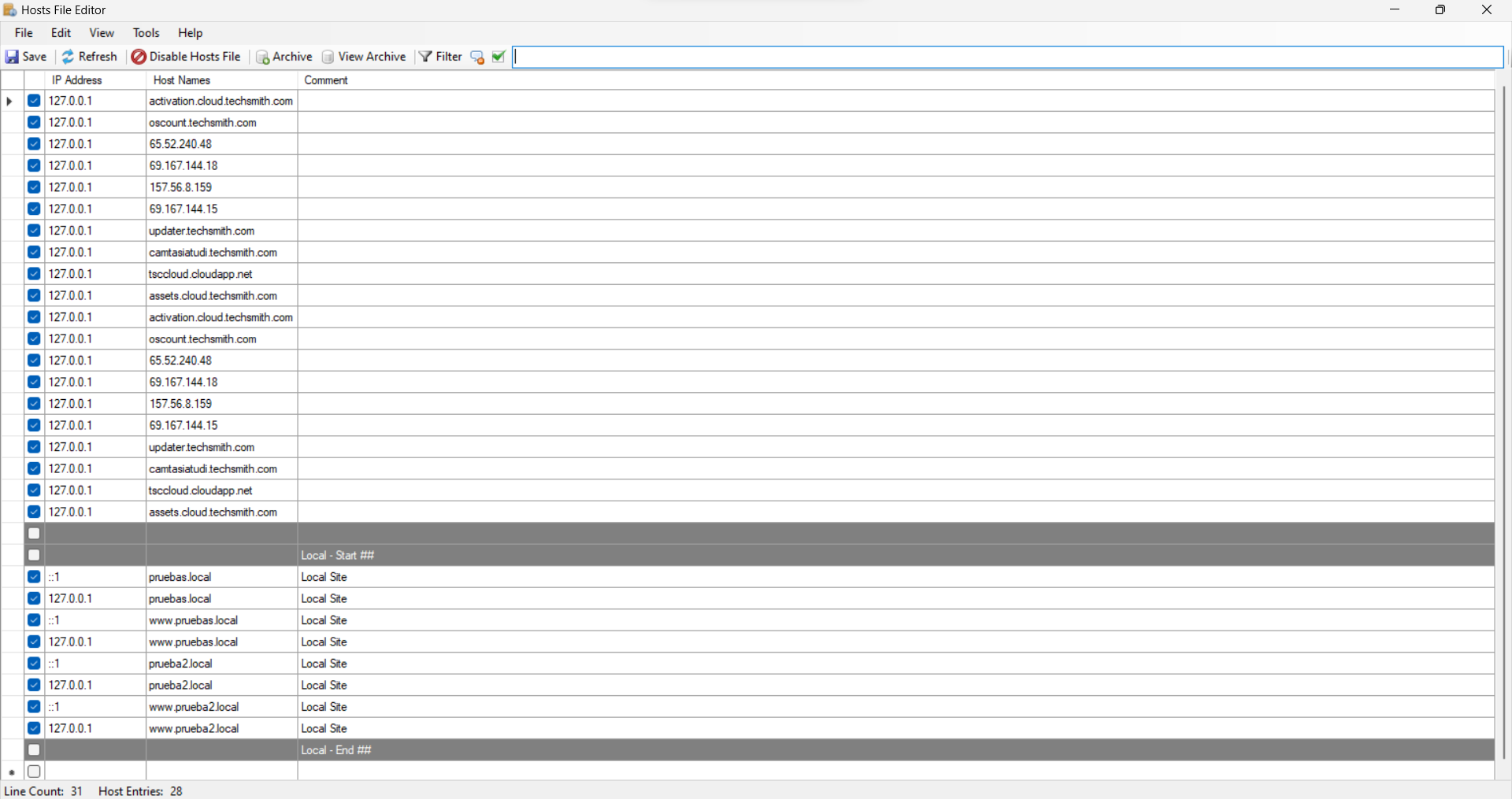 Cuando abrimos esta aplicación, estará tomando por defecto nuestro archivo Hosts en nuestra PC. Lo interesante es que la interfaz nos brinda la opción de agregar esta información en un formato de columnas. Aquí, podemos ingresar la dirección IP y el dominio correspondiente, además de proporcionar una descripción que nos ayude a identificarlo con rapidez en el futuro si es necesario. Esta característica hace que el proceso sea aún más organizado y fácil de gestionar.