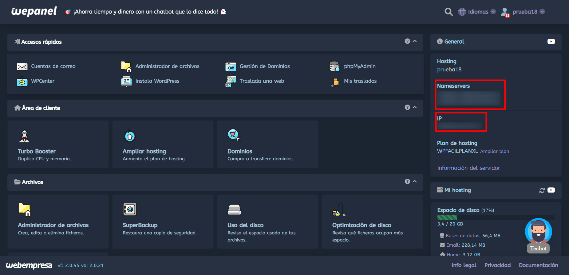 Ingresamos al wepanel, una vez dentro solo debemos enfocarnos en el área de la derecha donde vemos tanto los DNS como la IP de nuestro dominio. Aquí podemos copiar esta dirección IP que luego la necesitaremos, de esta forma no estamos con esta página abierta en todo momento.