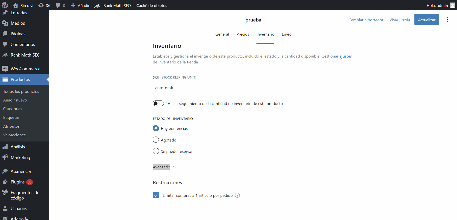 Cantidad de inventario disponible: forma parte de los ajustes avanzados, pero tenemos disponible de igual forma la cantidad exacta que tenemos en inventario para un producto