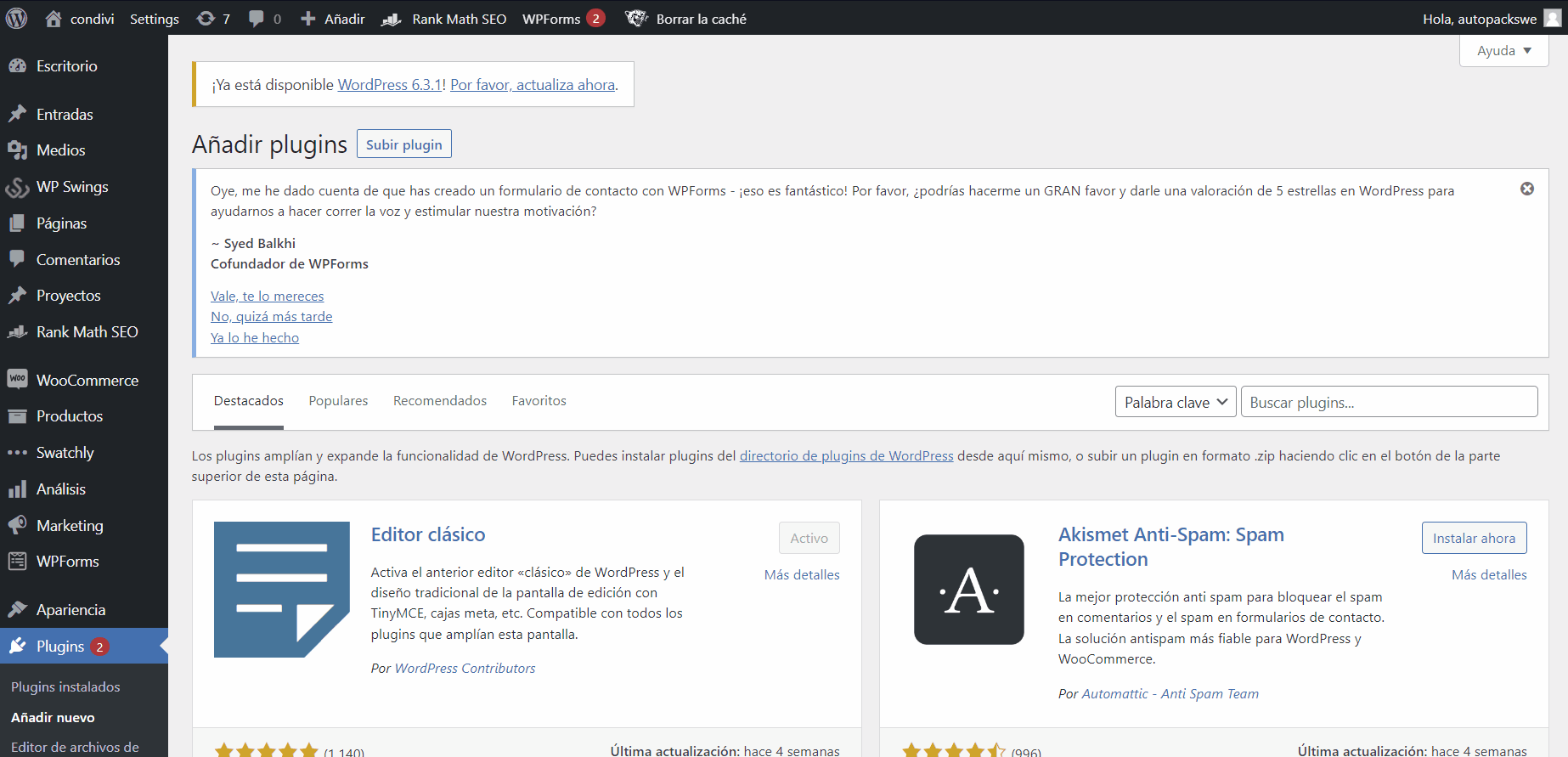 Si lo que necesitamos es una instalación manual, podemos descargar el plugin. Luego, subirlo en formato ZIP a través de Plugins > Añadir nuevo > Subir plugin.