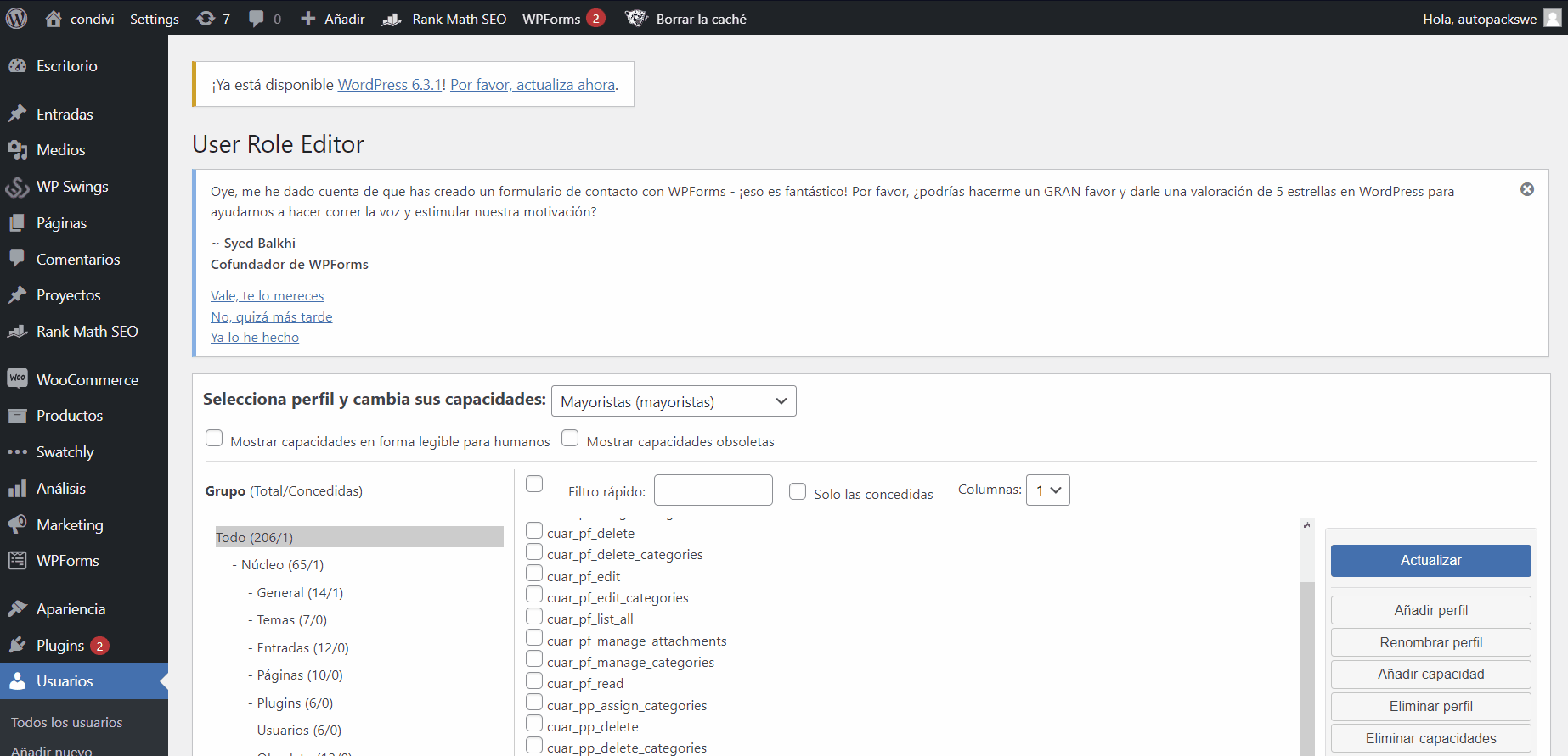 Una vez hecho esto podemos ver que del lado derecho tendremos la lista de opciones disponibles y al hacer clic en ellas se nos mostraran los permisos que podemos activar o desactivar, por ejemplo, ingresamos al área de WooCommerce. Una vez aquí buscamos por ejemplo la palabra delete, y quitamos los permisos para que el mayorista en este caso no pueda eliminar nada de nuestro sitio.