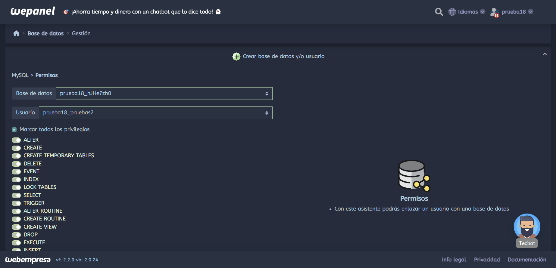 Por último, tipo_de_permiso corresponde a todos los permisos que hemos visto de una forma más amigable disponible en nuestro wepanel, algunos cPanel también las poseen, pero esto puede variar según la versión MySQL con la que estemos trabajando.