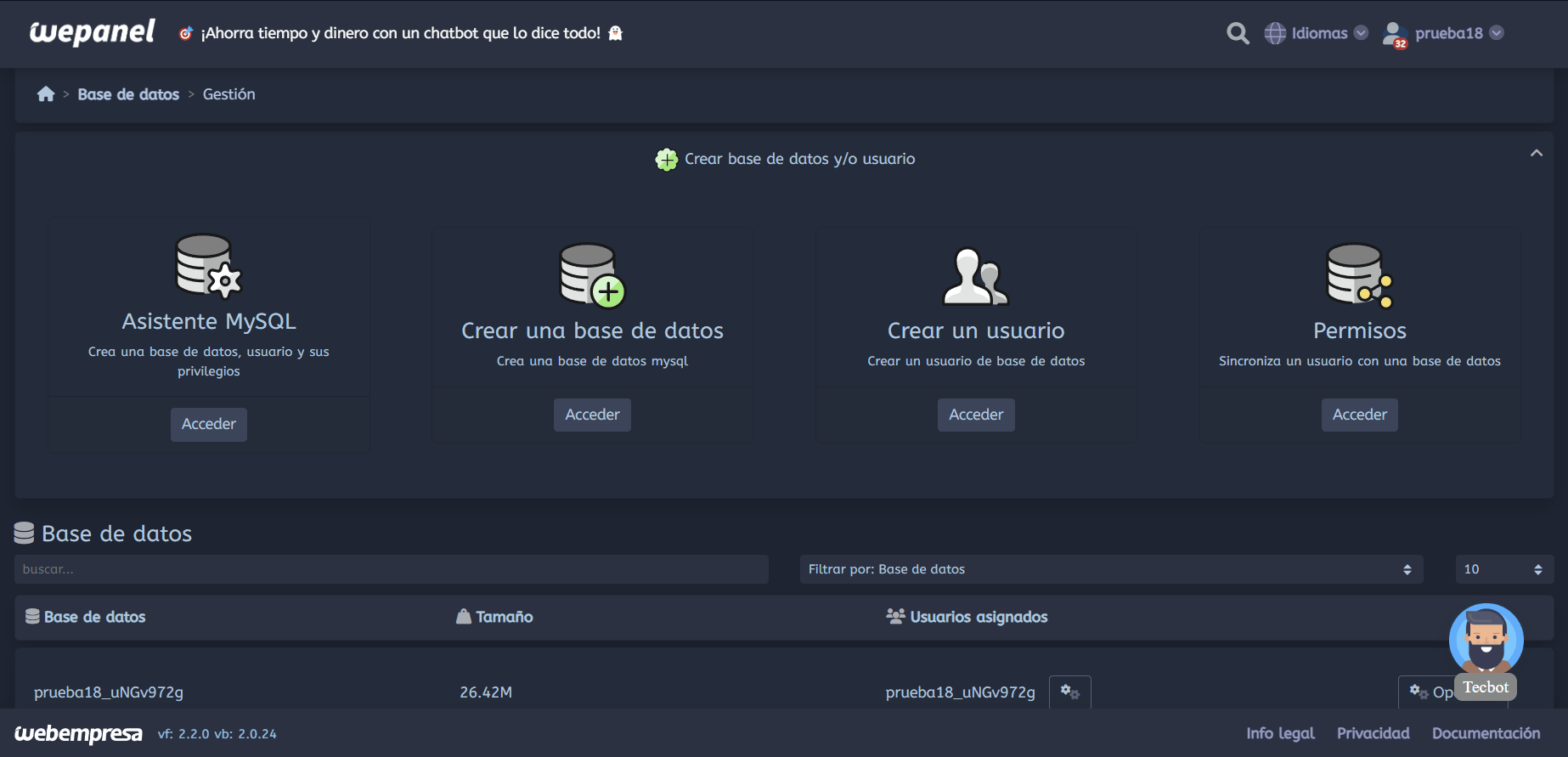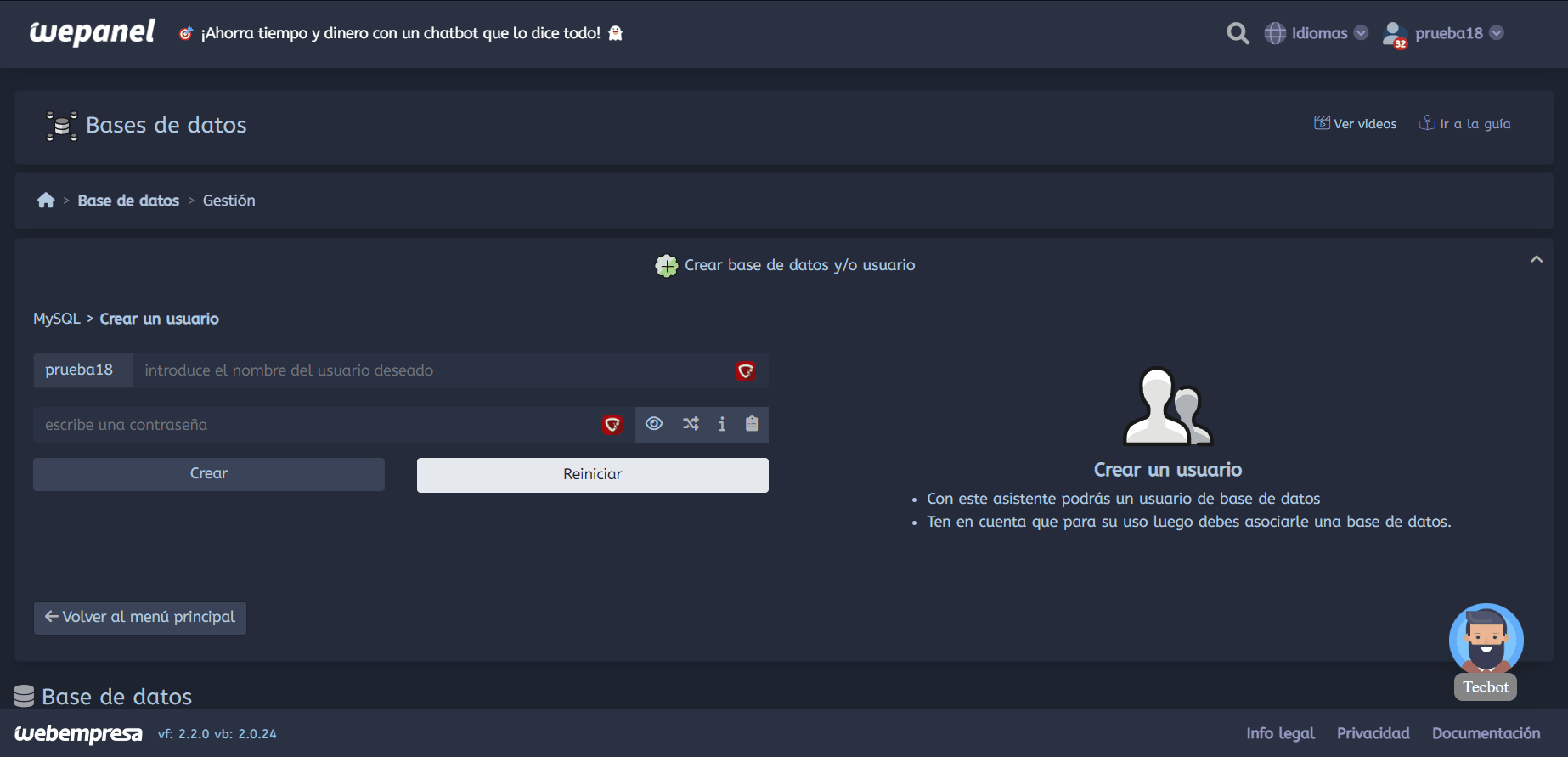 Para poder crear el usuario si estamos en un wepanel debemos hacer clic en el botón respectivo de Gestión de bases de datos. Esto nos habilitará una serie de opciones en la que destacan la creación del usuario que necesitamos crear.
