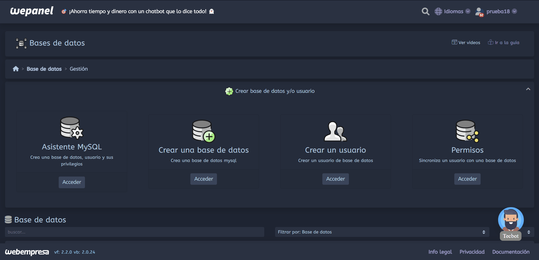 Los pasos que vamos a ver a continuación están orientados a un wepanel, sin embargo, en caso de tener un cPanel las opciones serán similares y podemos hacer referencia a ellas dentro de esta guía, de la misma forma que si contamos con una consola de MySQL al final del todo tendremos un apartado en caso de que queramos hacerlo.