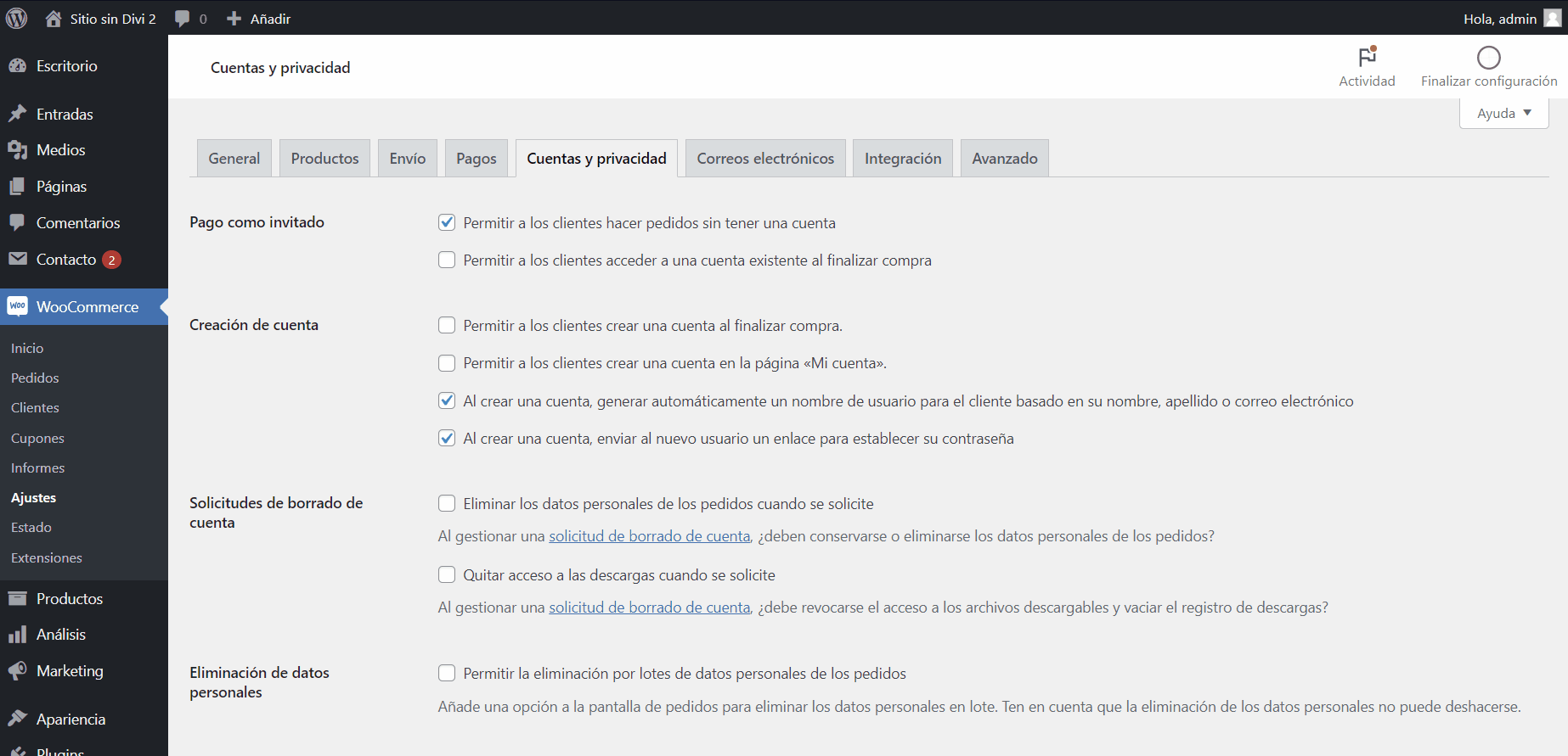Lo primero que tenemos que hacer es ingresar de nuevo al panel de ajustes de nuestro WooCommerce, para ello ingresamos en nuestro dashboard de WordPress a WooCommerce > ajustes. Una vez dentro solo tenemos que ingresar a la pestaña de Cuentas y privacidad para ver todos los ajustes de creación de cuenta.