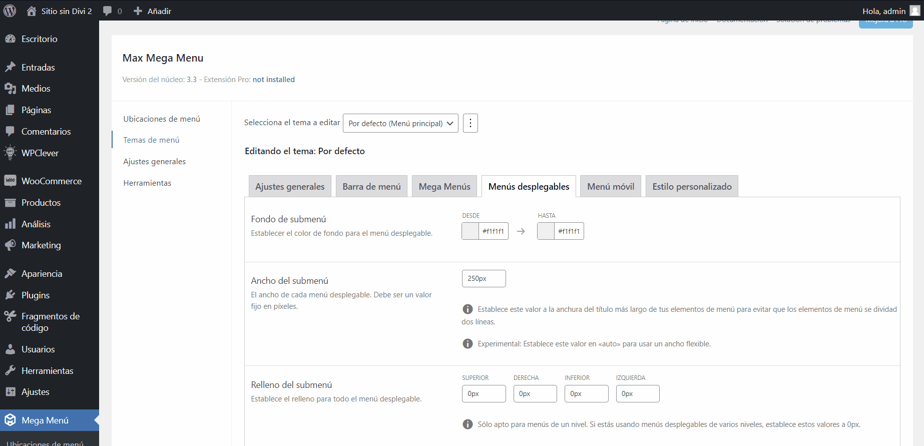 Una vez tenemos nuestro mega menú creado es posible que no se vea como lo esperamos, esto se debe a que no hemos configurado aún lo que hemos abierto en la primera pestaña, es decir, la configuración del plugin. Recordemos que esta la encontramos en el panel lateral bajo el nombre de Mega menú, en caso de que la cerrásemos.