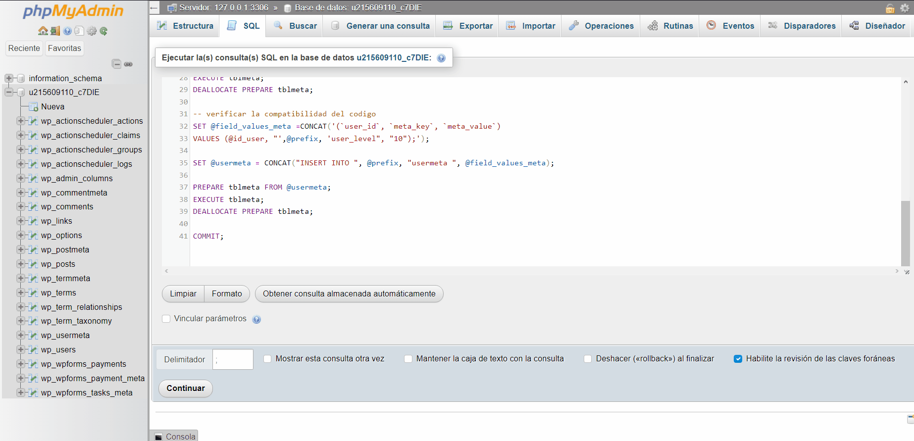 Si seguimos los pasos anteriores vamos a ubicar nuestra base de datos que está utilizando nuestra instalación de WordPress, una vez ubicada hacemos clic en el botón de la parte superior que indica SQL, este nos mostrara una consola pequeña donde vamos a escribir el código al cual tenemos que hacer algunos ajustes según nuestra instalación: