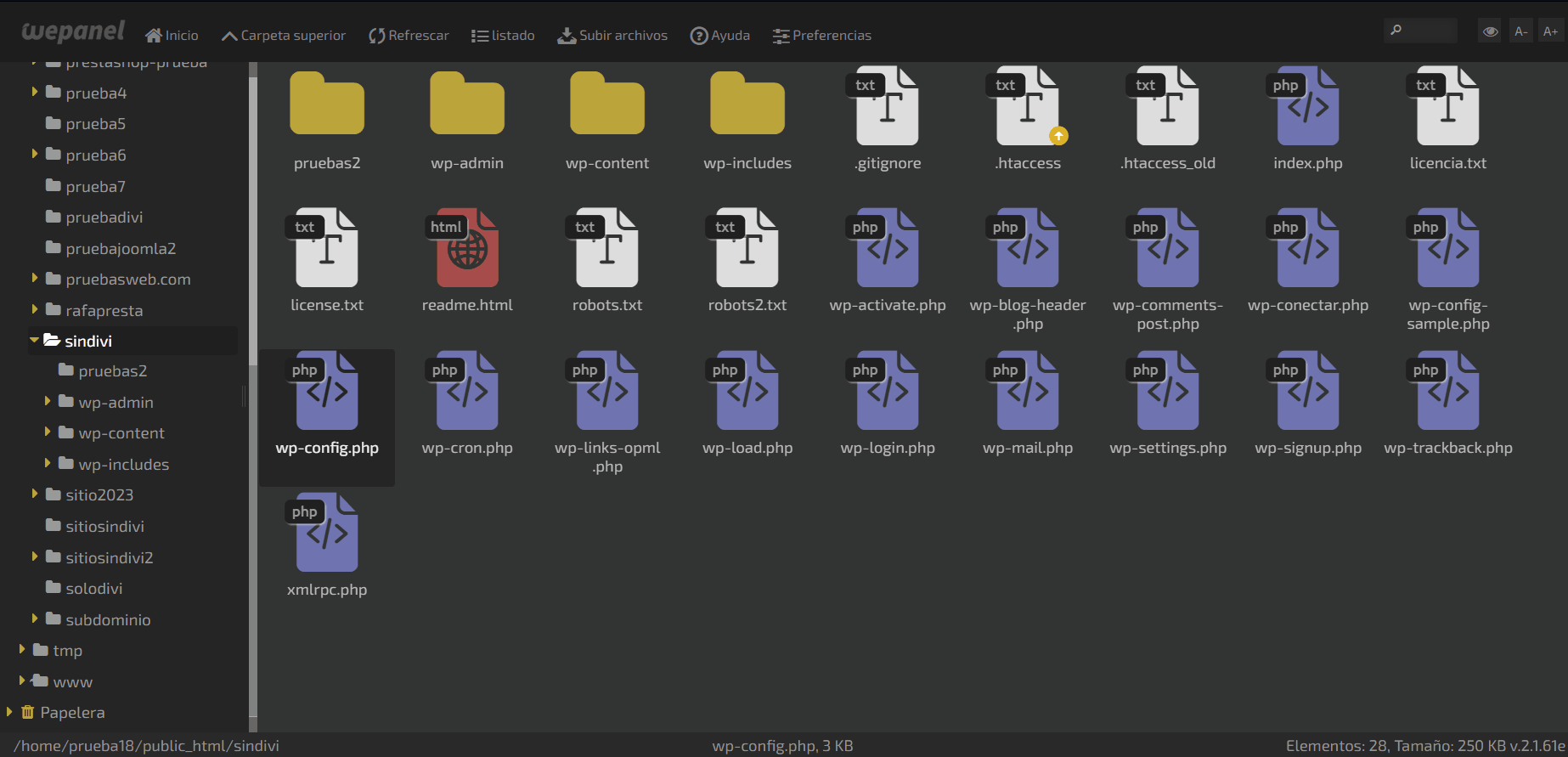 Aquí una vez identificada nuestra instalación de WordPress con todos sus archivos, buscamos el que tenga el nombre de wp-config.php, este archivo controla la gran mayoría de ajustes en nuestra instalación, pero lo que tenemos que buscar en este archivo es una línea de código en particular.