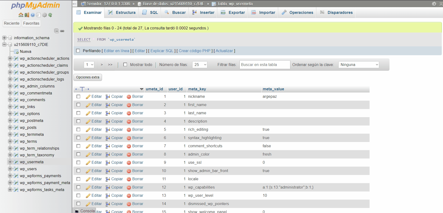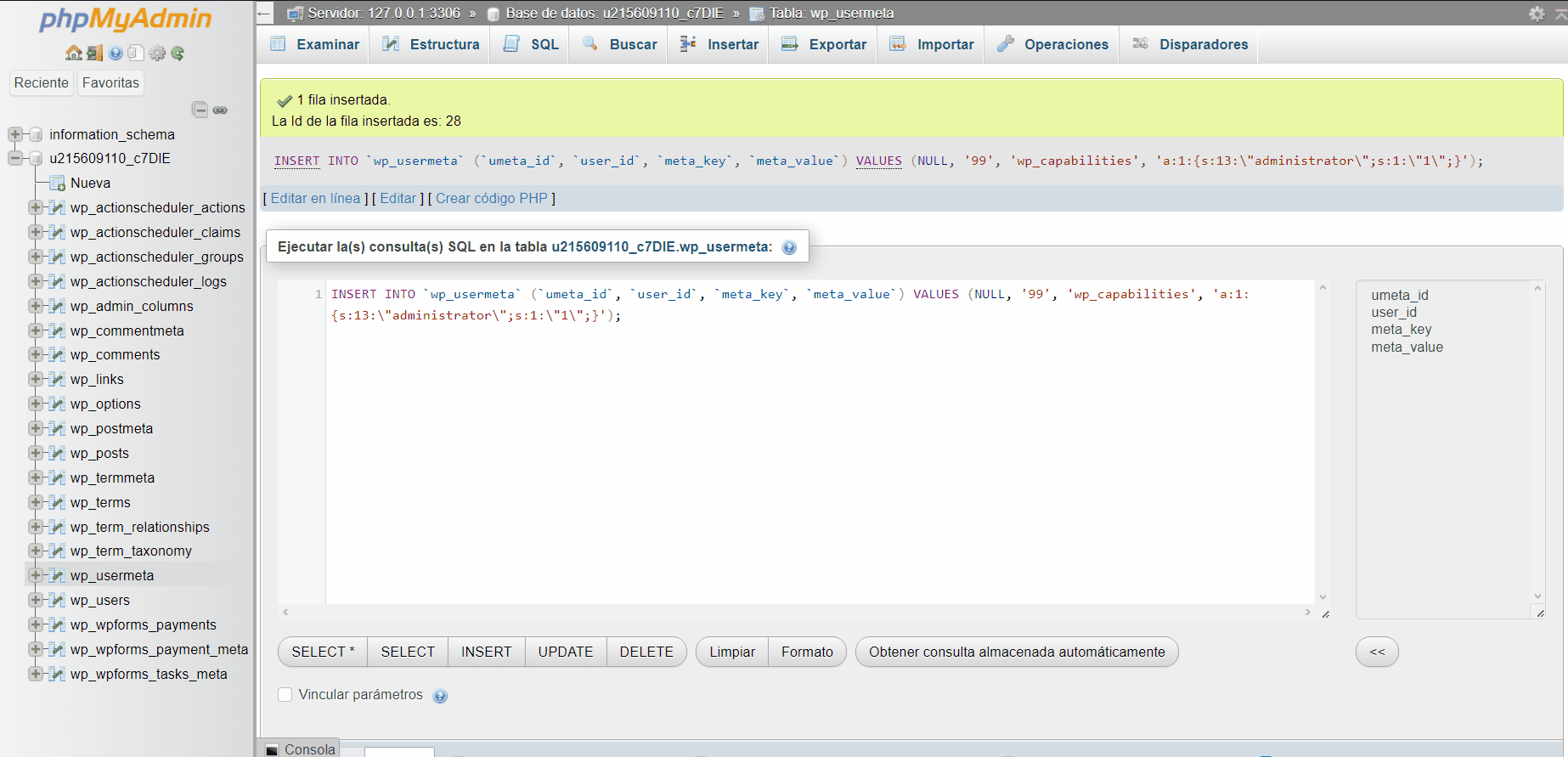 - meta_value: utilizaremos el siguiente código para generar el usuario como administrador a:1:{s:13:»administrator»;s:1:»1″;}