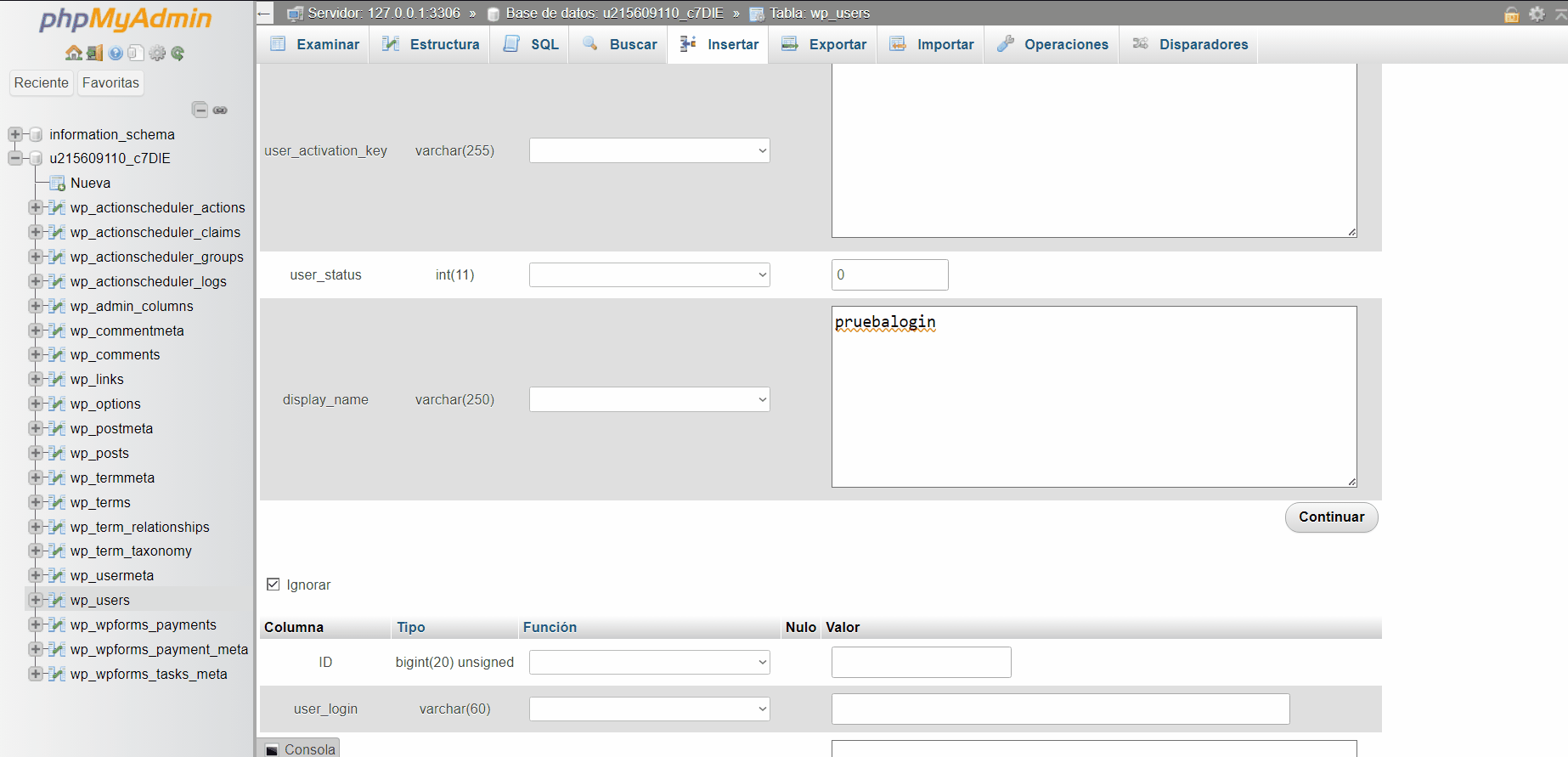 Vamos a comenzar agregando un nuevo usuario en la tabla wp_users. Para ello, ingresamos a esta tabla y hacemos clic en la pestaña Insertar. Aquí vamos a introducir los detalles del nuevo usuario. Necesitaremos un ID único (un número que no se haya utilizado en esta tabla), el user_login (el nombre de usuario para el inicio de sesión), y el user_pass (la contraseña, que debe ser convertida a MD5 para seguridad).