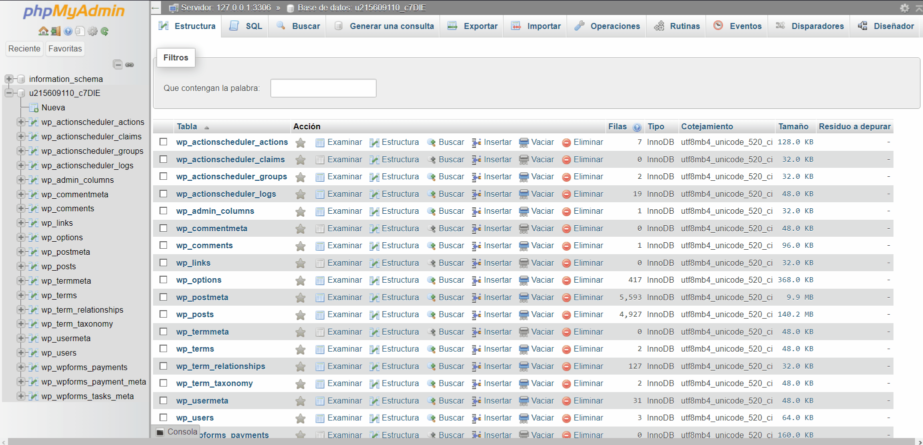 Una vez dentro seleccionamos nuestra base de datos que está utilizando nuestra instalación de WordPress, si no estamos del todo seguros sobre cuál es la base de datos que está utilizando nuestro WordPress no hay de que preocuparse.
