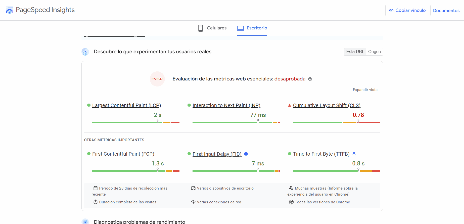 PageSpeed Insights: esta herramienta de Google no solo mide el INP, sino que también proporciona un análisis detallado de otros aspectos clave de rendimiento. PageSpeed Insights nos ofrece una visión clara de cómo se comporta nuestro sitio web en términos de capacidad de respuesta y qué podemos mejorar.