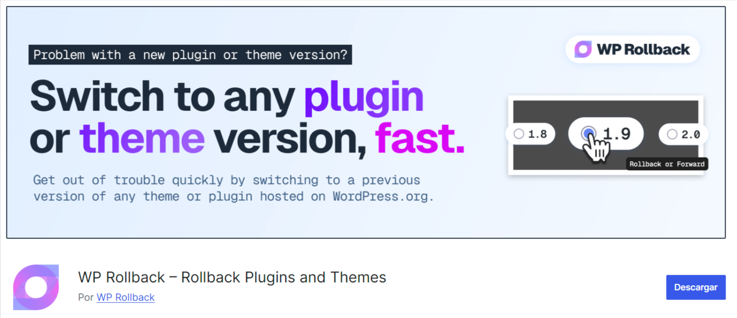 De esta misma forma podemos hacer el ajuste en nuestro WordPress, utilizando herramientas accesibles para ello, como es el caso de wp rollback. Un plugin que nos ayudara a revertir versiones de plugins o temas para poder encontrar una en la que nuestro sistema no presente la falla.