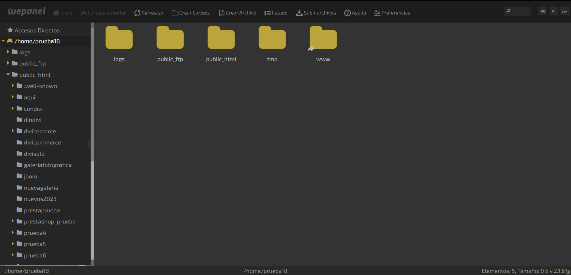En el administrador de archivos, tendremos que localizar el directorio donde se encuentran los archivos de WordPress. En general, este se llama public_html o tiene el nombre de nuestro dominio. Dentro de este directorio, vamos a ver una lista de archivos y carpetas como wp-content, wp-admin, y otros. En nuestros servidores la ruta sería: