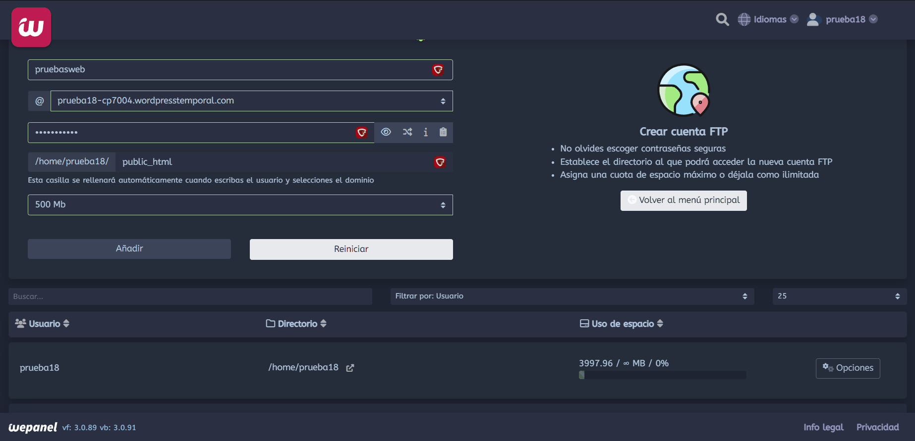 Todos estos datos podemos ubicarnos en nuestro WePanel, una vez hacemos clic en FTP y tenemos la lista de los usuarios, veremos un botón de Opciones. Este botón nos mostrará los datos de acceso por si tenemos dudas sobre ellos.