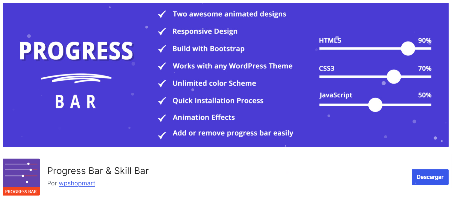 Progress Bar & Skill Bar es un plugin gratuito para WordPress que permite a los autores y desarrolladores mostrar barras de progreso atractivas en sus publicaciones o páginas en WordPress. Este complemento es en especial útil para exhibir habilidades en porcentajes, proporcionando una representación visual clara y profesional.