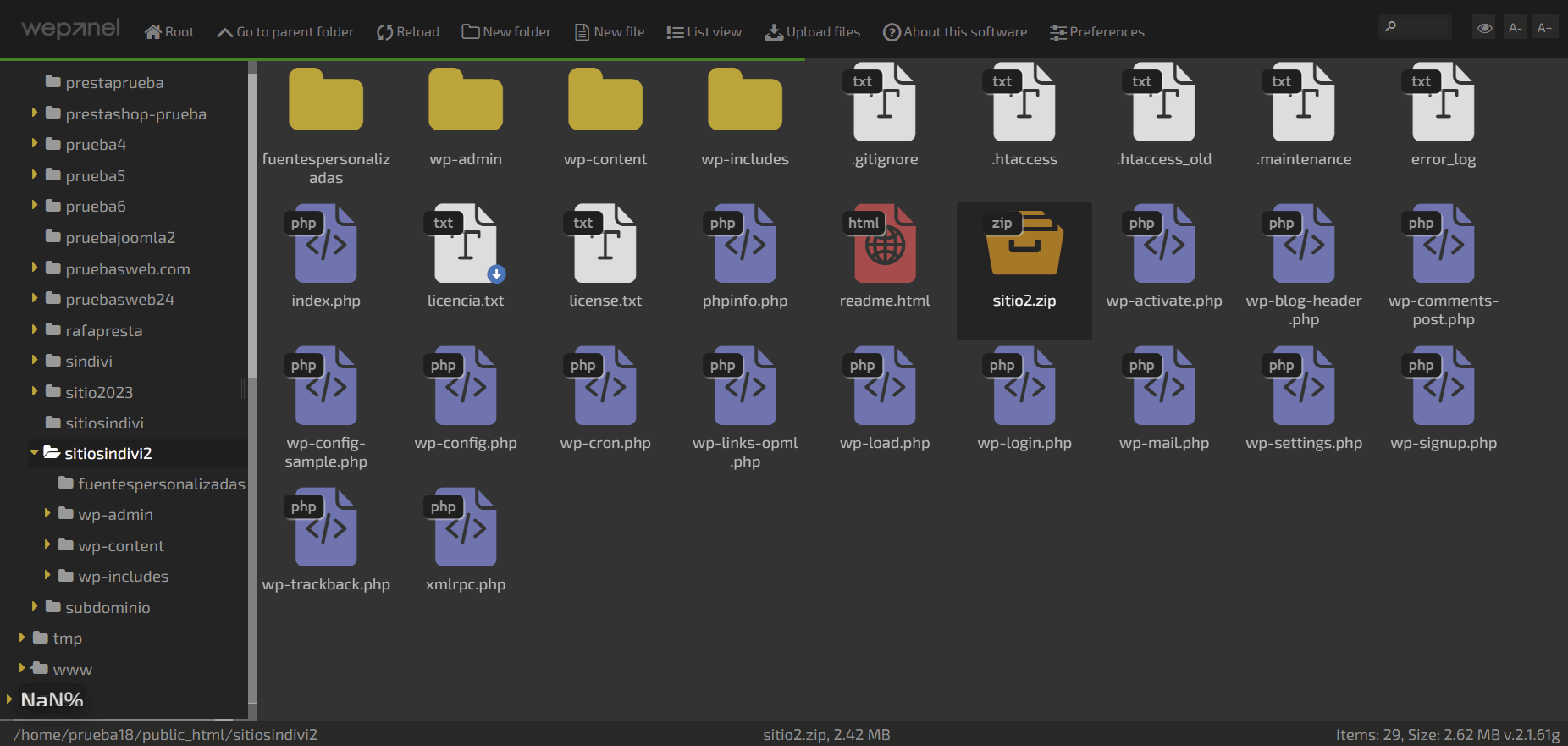 Si tienes varias instalaciones, accede a la carpeta de la web implicada en el traslado. En el caso de que solo tengas una instalación, al acceder a public_html verás todos los archivos y carpetas del sitio web.