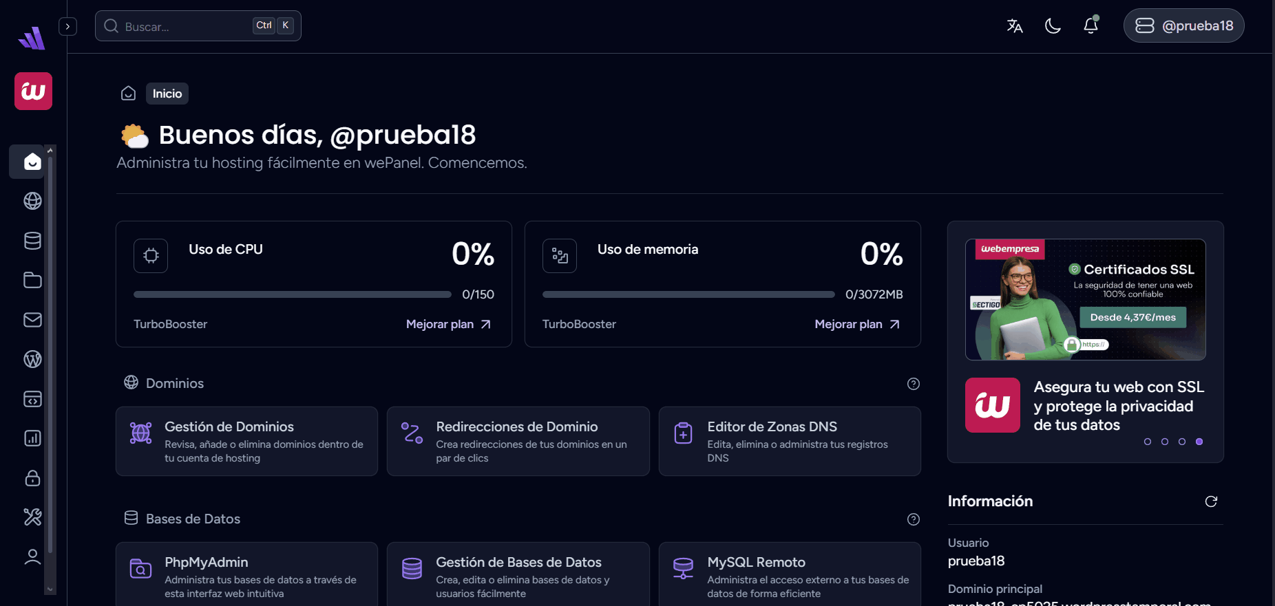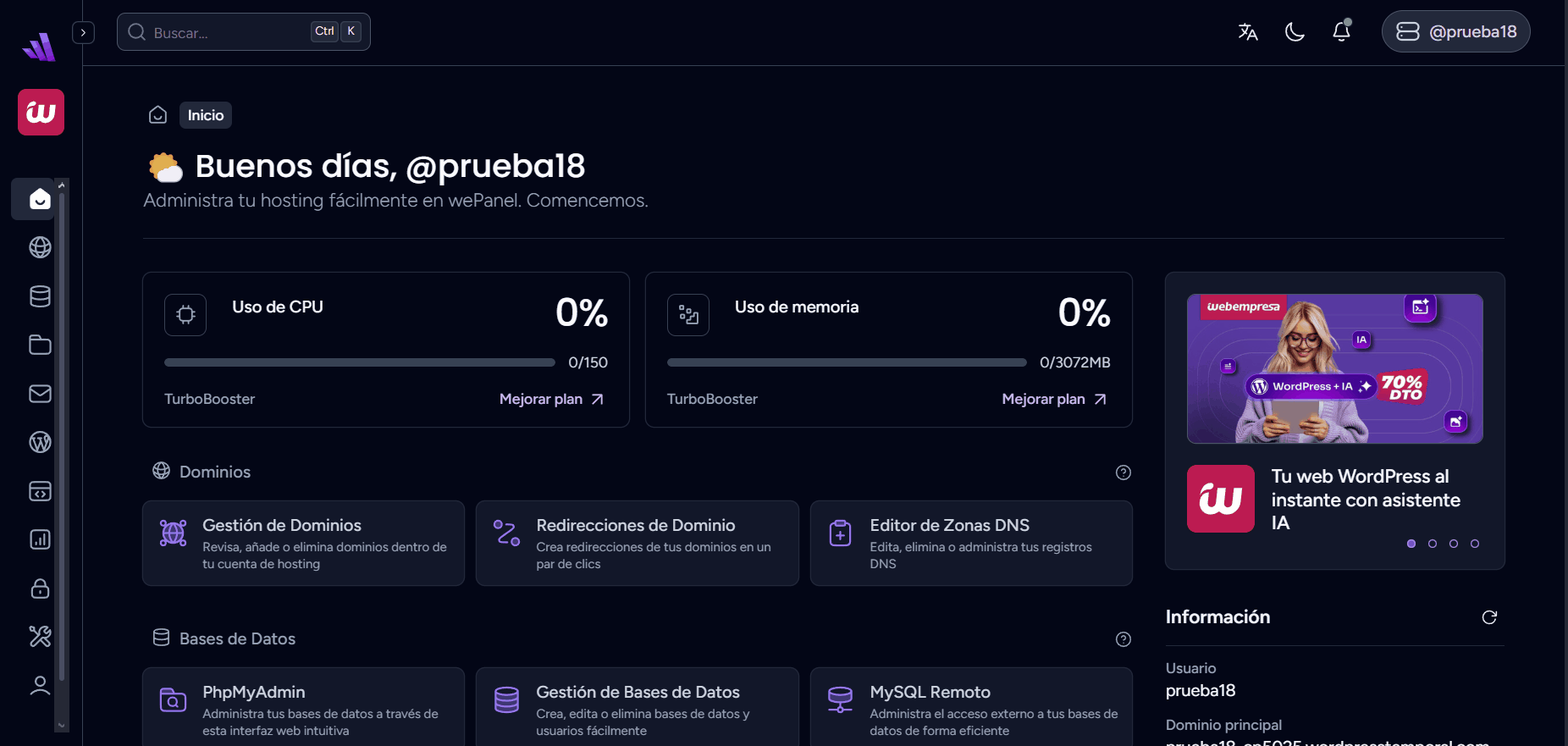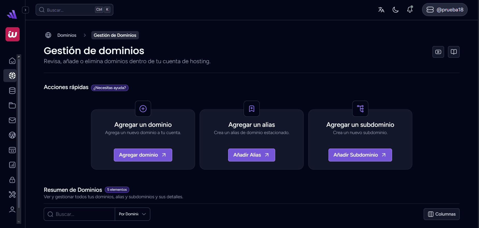 Lo siguiente es dar de alta el dominio que utiliza el sitio web en el nuevo Hosting, o alojamiento de destino, de manera que posteriormente lo puedas vincular al WordPress migrado.