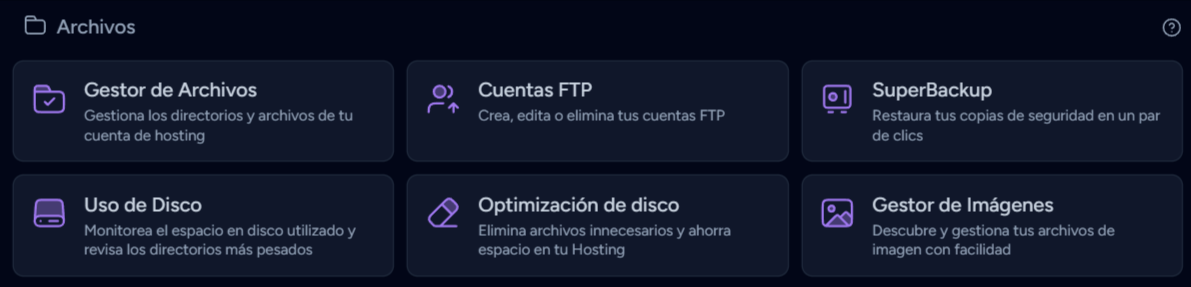 Aquí vas a encontrar todas las herramientas relacionadas con la gestión de archivos alojados en la cuenta de Hosting, tanto las que te permiten editarlos, subirlos o eliminarlos como las destinadas a las copias de seguridad o incluso la optimización.