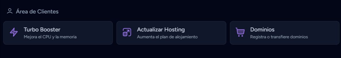 Al igual que el grupo anterior dispone de enlaces hacia herramientas internas del propio WePanel y alguna externa, de otros servicios de Webempresa, este grupo muestra accesos directos a herramientas o servicios de Webempresa relacionados con acciones que el cliente puede llevar a cabo para ampliar servicios, mejorar aspectos de hardware de su actual hosting o contratar nuevos dominios.