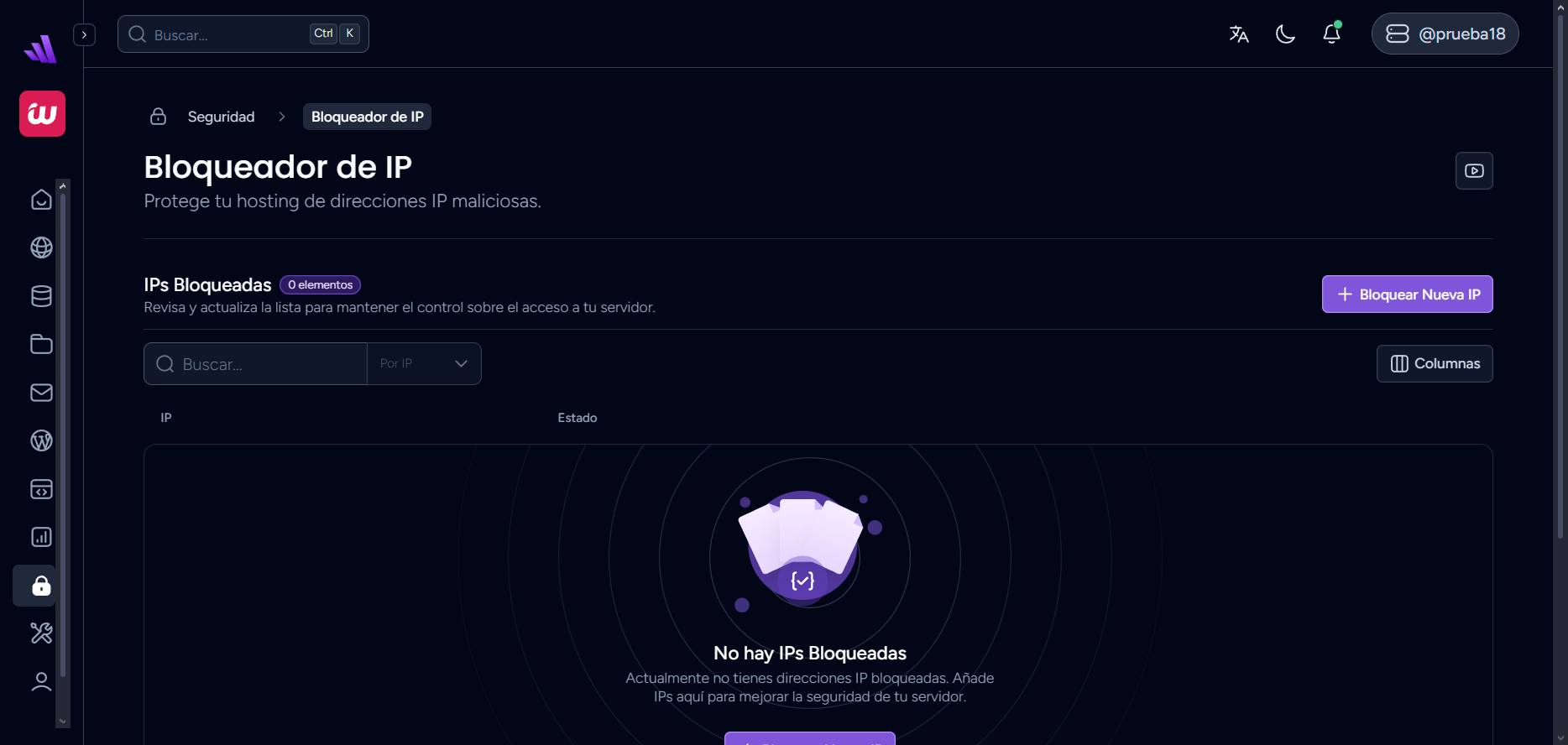El bloqueador de IP en WePanel es una herramienta clave para evitar accesos no deseados a nuestro sitio. Con esta función, podemos bloquear direcciones IP específicas o rangos completos que estén generando tráfico malicioso, ataques de fuerza bruta o intentos de hackeo.