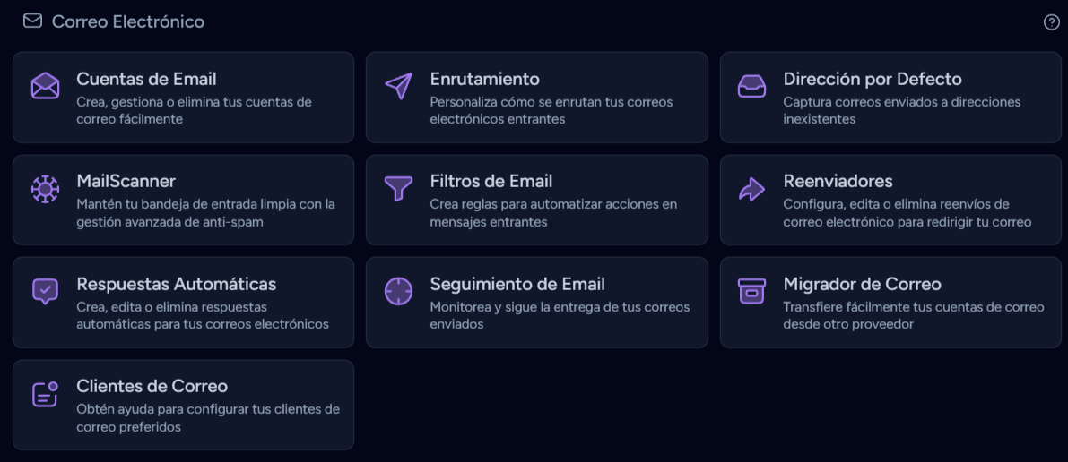 Todas y cada una de ellas están enfocadas en ayudarte con la gestión de los correos, las cuentas de email, la configuración de clientes de correo para cuentas existentes, el reenvío de correos entre cuentas o la aplicación de reglas para combatir el correo no deseado en tus buzones de email.