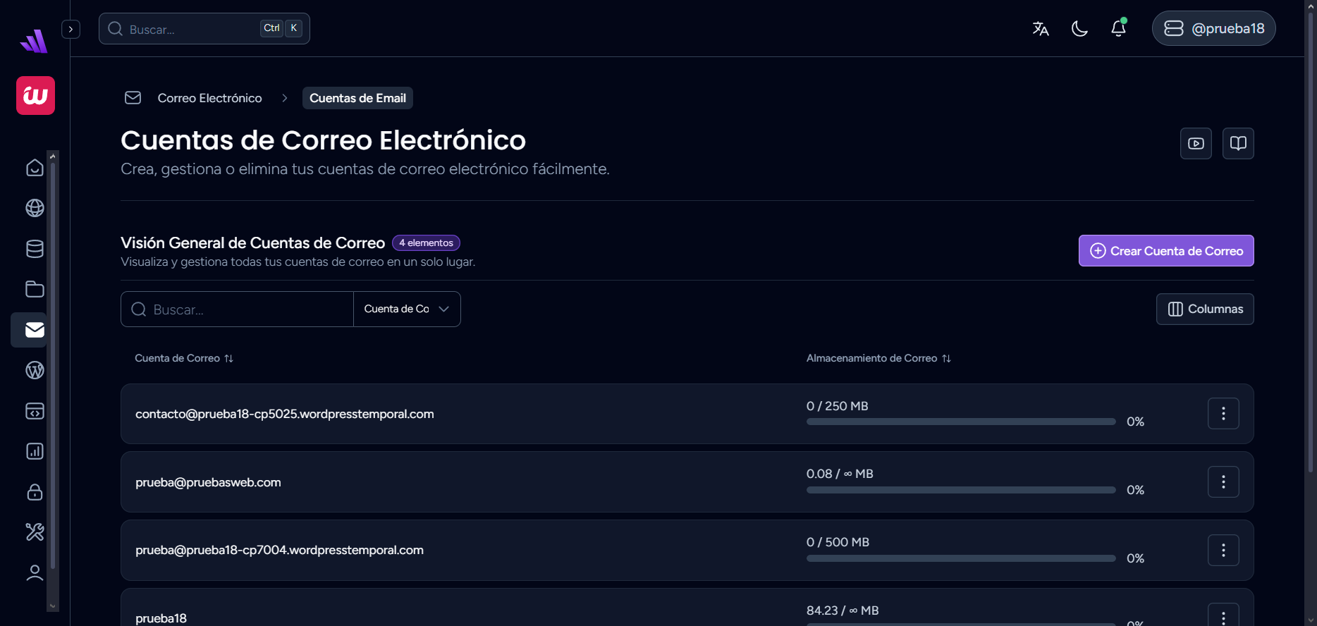 Los correos electrónicos son parte fundamental de los dominios, normalmente asociados a sitios web, por lo que poder centralizar las cuentas de email, crearlas, eliminarlas, cambiar contraseñas de acceso a buzones de correo, acaban siendo tareas cotidianas fáciles de realizar desde este grupo de herramientas de WePanel.