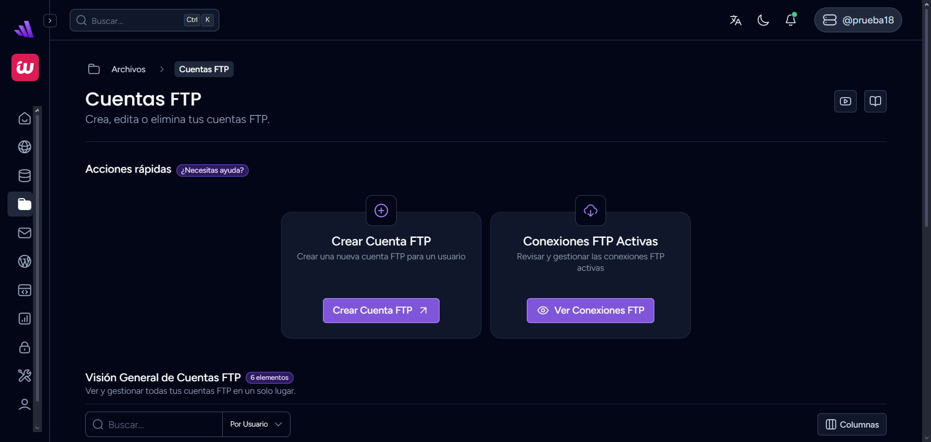 - Crear una cuenta FTP: para crear cuentas de acceso por FTP para usuarios específicos, administradores o desarrolladores externos.