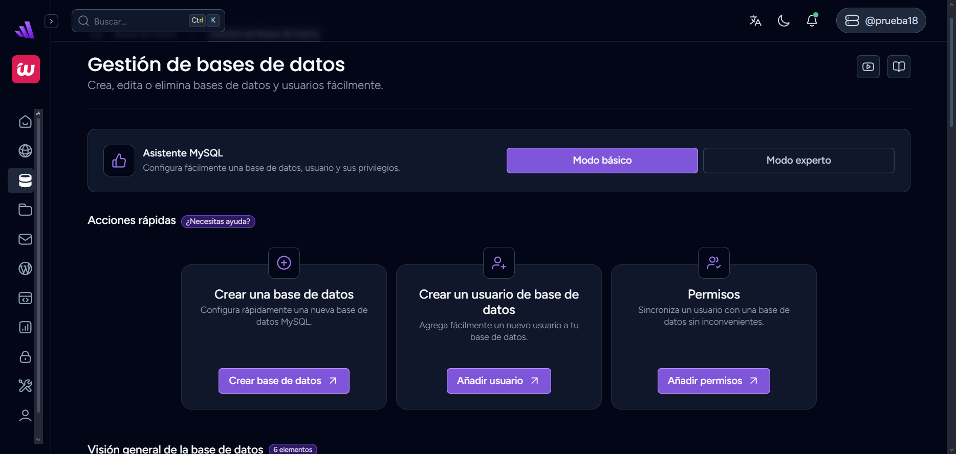 Antes de poder trabajar con las tablas de determinada base de datos, o incluso de importar contenido desde un archivo SQL, tienes que crear la base de datos, y esto lo puedes hacer desde la herramienta Gestión de bases de datos de tu panel de hosting WePanel.