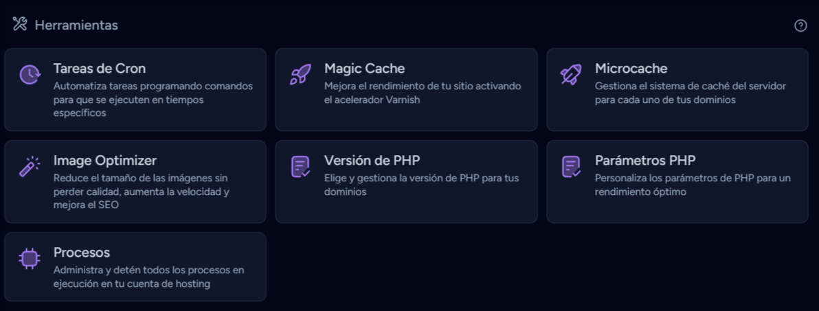 Hay funcionalidades que funcionan de forma global, para todo el Hosting o de manera específica para un sitio, y todas ellas las puedes encontrar agrupadas en Otras herramientas para utilizarlas cuando las necesites.