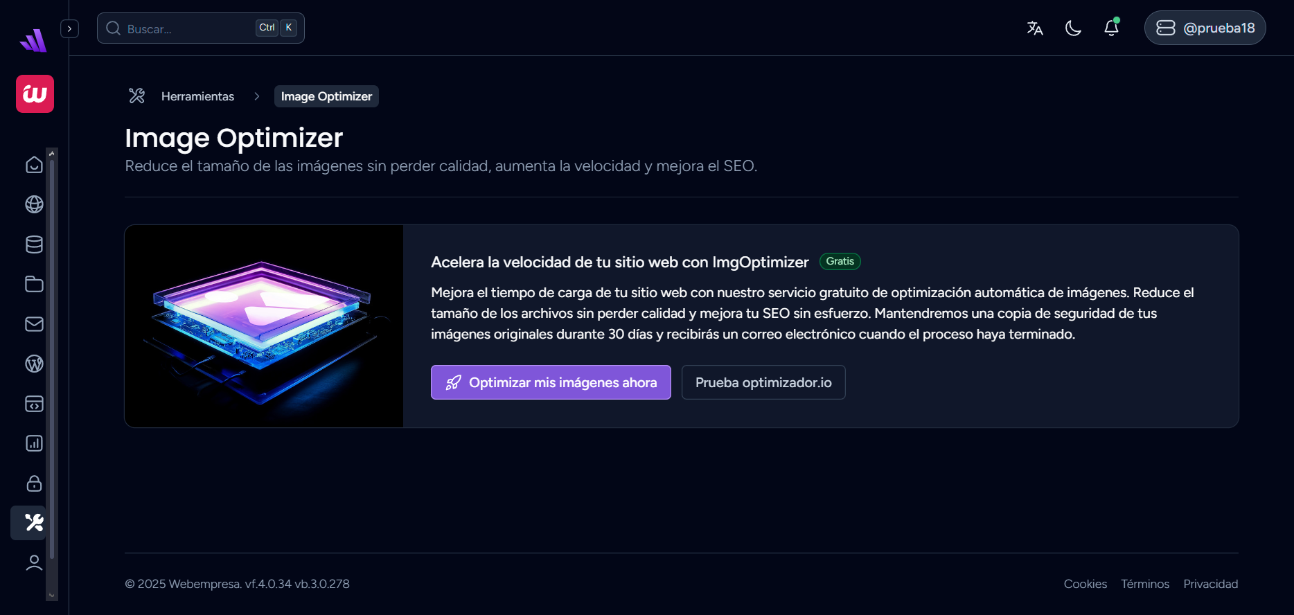Image Optimizer en WePanel es una herramienta que nos ayuda a reducir el peso de las imágenes sin perder calidad, lo que mejora la velocidad de carga del sitio y reduce el consumo de recursos del servidor.
