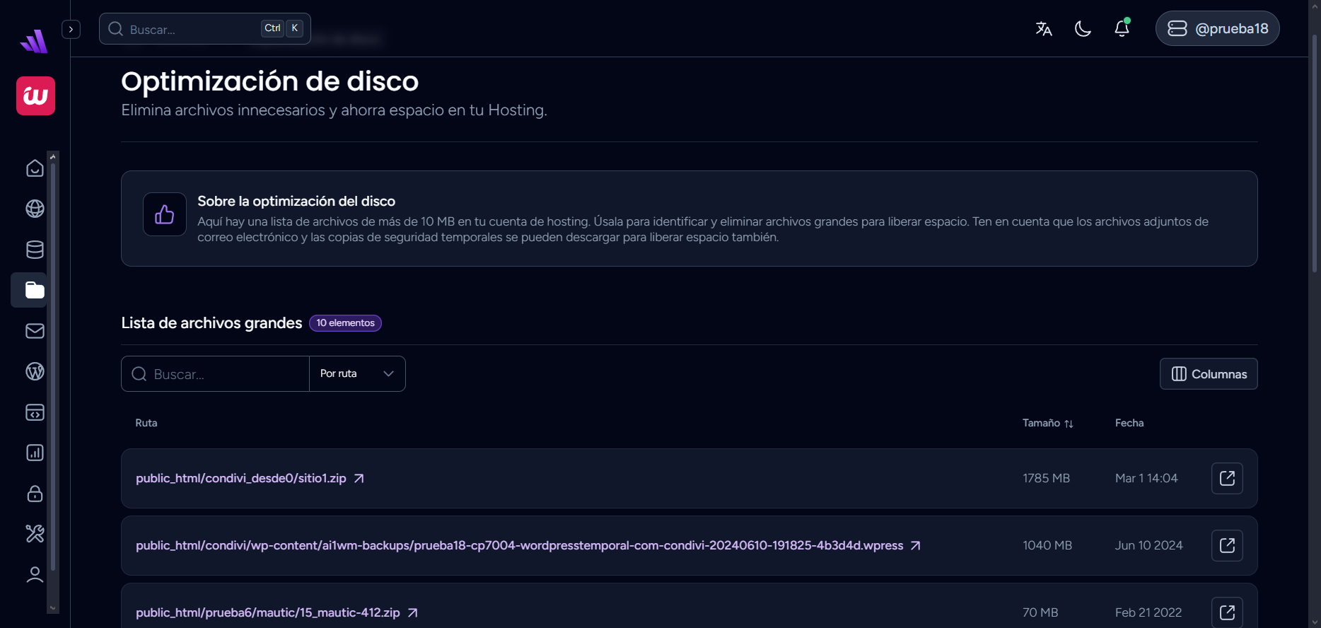 Se acabó eso de tener que invertir minutos y minutos en navegar con el gestor de archivos por toda la estructura de carpetas en tu Hosting para localizar aquellos que tienen mucho tamaño, que es posible descargar a tu ordenador y eliminarlos del hosting para liberar espacio en disco.
