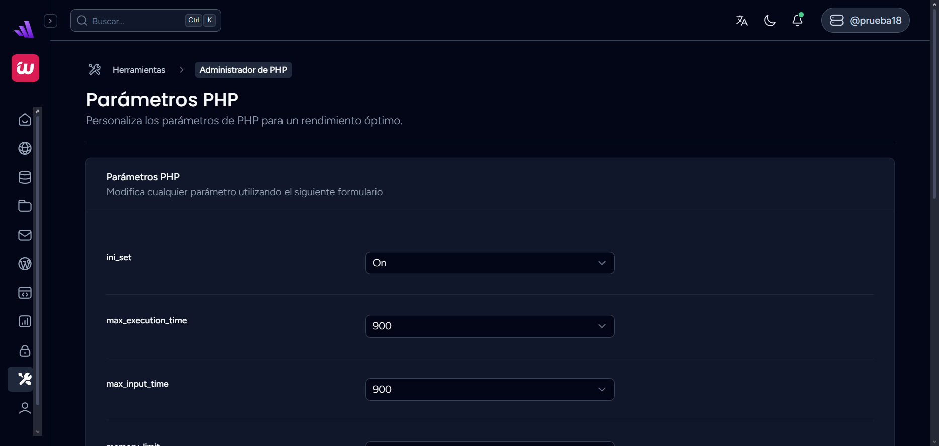 Si nuestro sitio requiere ajustes personalizados para mejorar su rendimiento o evitar errores de ejecución, WePanel nos da la flexibilidad de modificar estos valores sin necesidad de editar archivos de forma manual.