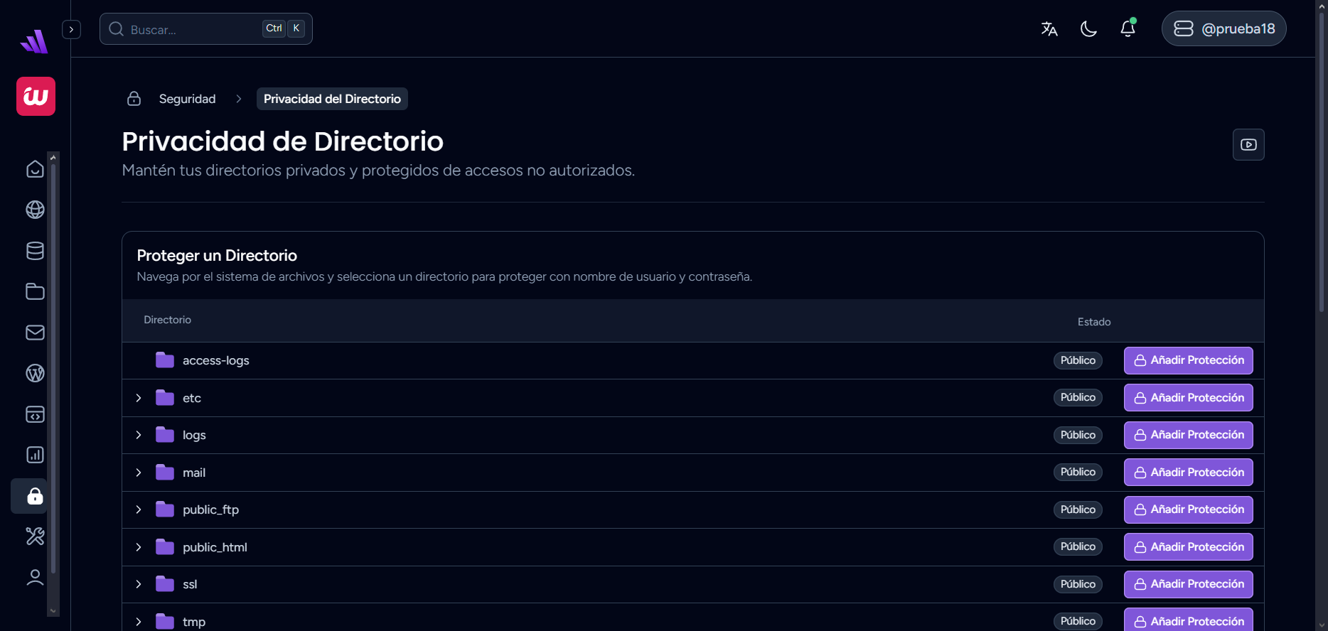 En ocasiones, los archivos y directorios de nuestro sitio pueden quedar expuestos si no configuramos bien la seguridad. WePanel nos permite proteger estos directorios mediante contraseñas y restricciones de acceso.