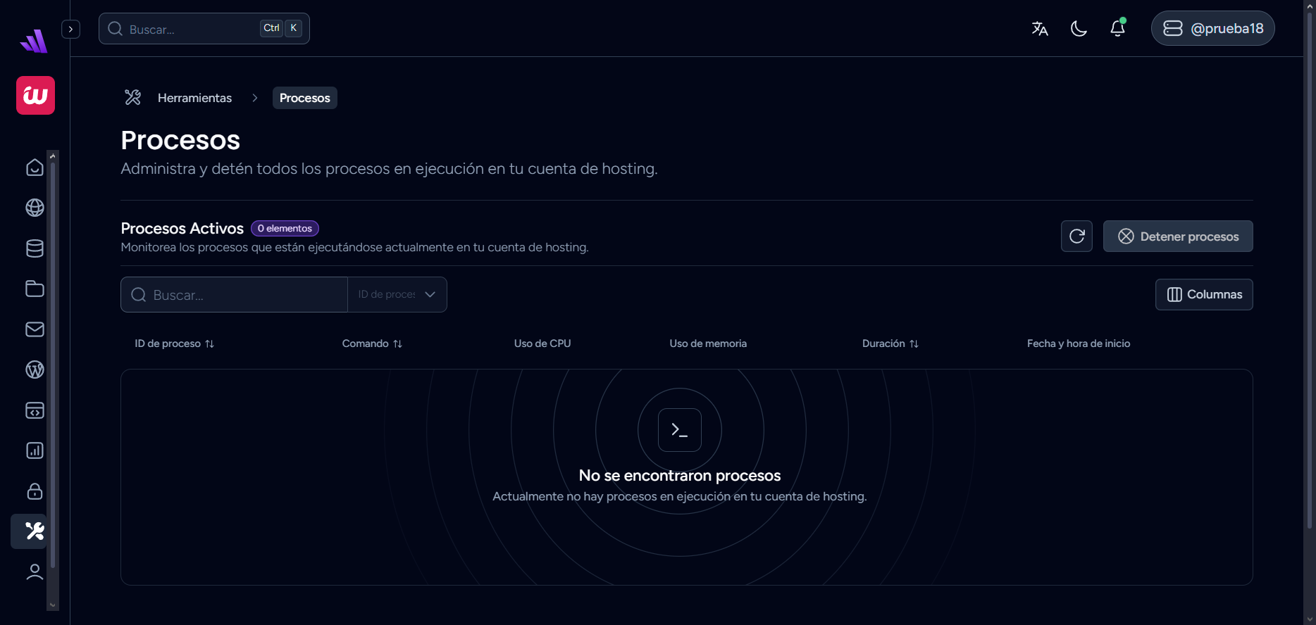 Si notamos que nuestro sitio está funcionando lento o que los recursos del servidor se están agotando con rapidez, revisar los procesos activos en WePanel nos ayudará a encontrar la causa y tomar medidas correctivas.