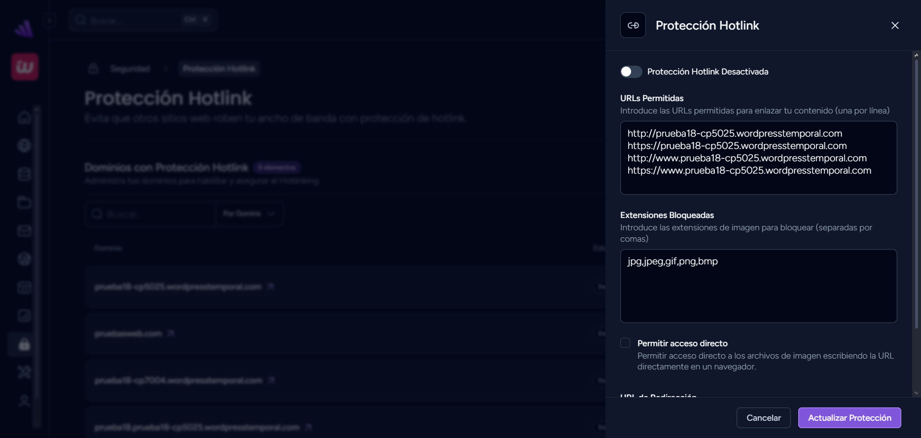 La protección hotlink es una función de WePanel que evita que otros sitios web utilicen nuestros archivos (imágenes, videos o documentos) sin permiso, robando ancho de banda de nuestro servidor. Por qué es importante activar la protección hotlink: