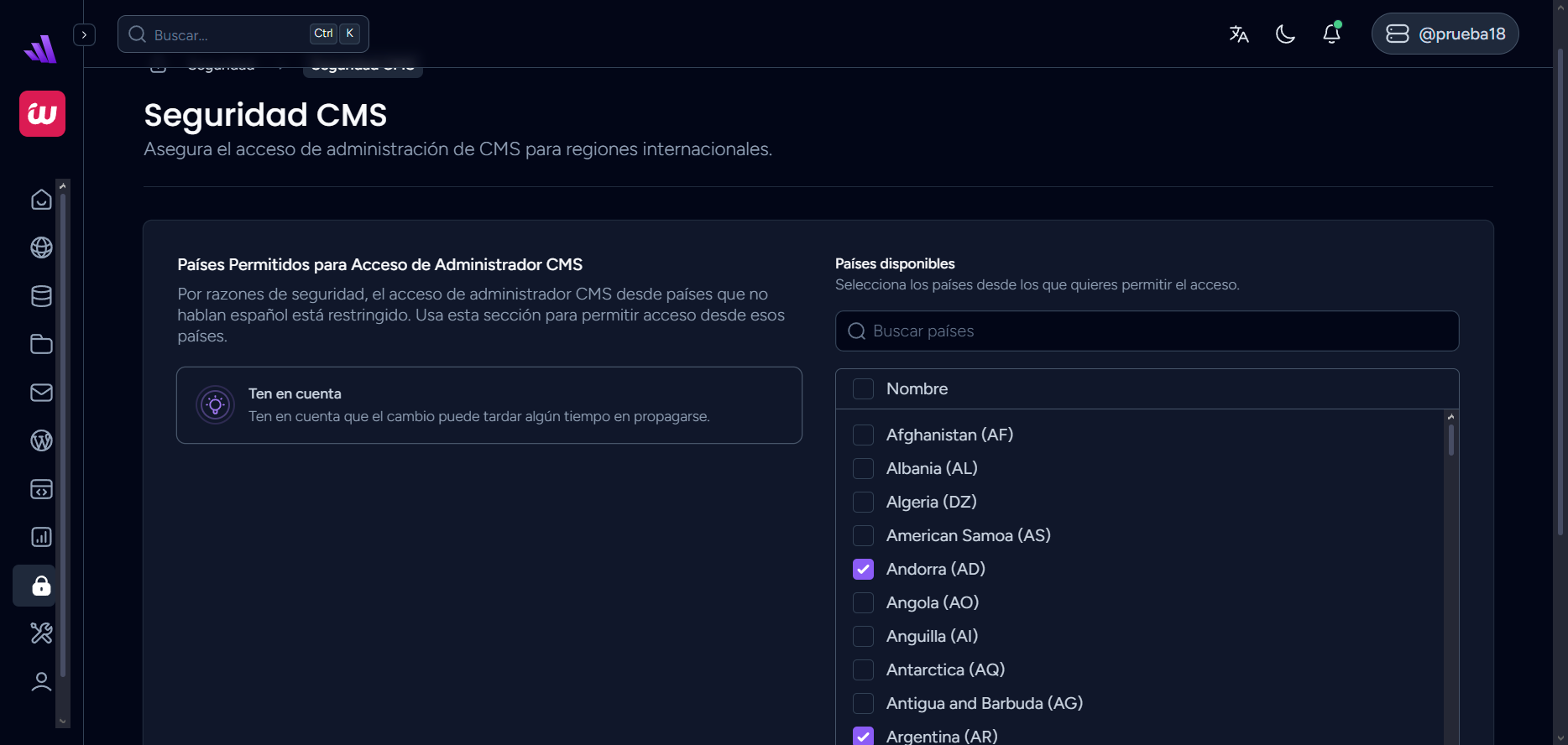 El CMS es el corazón de nuestro sitio web, y mantenerlo seguro es fundamental para evitar hackeos y vulnerabilidades. En WePanel, podemos aplicar diversas configuraciones a las IPs permitidas para reforzar la seguridad de WordPress, Joomla u otros CMS.