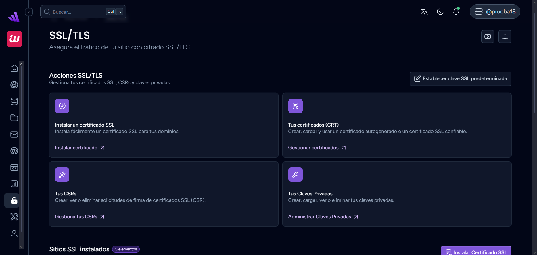 El SSL/TLS es un estándar de seguridad esencial para cualquier sitio web, ya que cifra la información que se transmite entre el navegador del usuario y el servidor, protegiéndola de accesos no autorizados. En WePanel, podemos gestionar y activar certificados SSL de forma sencilla para garantizar una navegación segura y confiable.