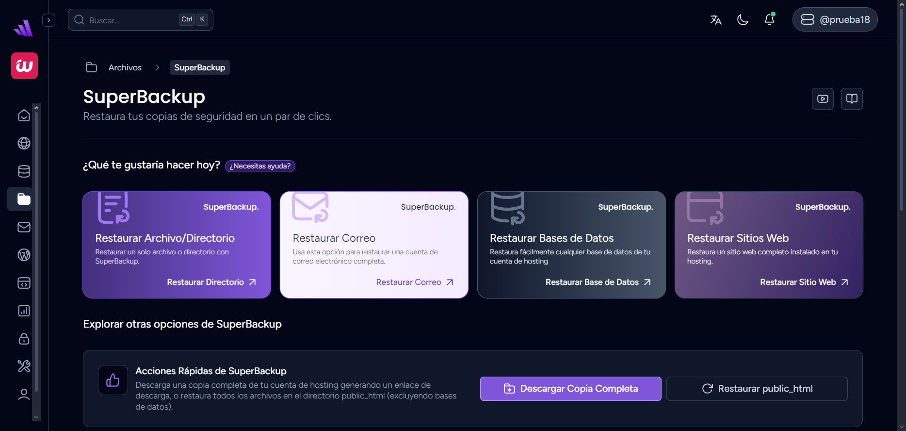 La herramienta es bastante intuitiva de utilizar y con ella puedes realizar restauraciones de toda la cuenta de Hosting, solo de la carpeta principal public_html, de una carpeta o archivo específico, también restaurar bases de datos o una web WordPress completa específica.