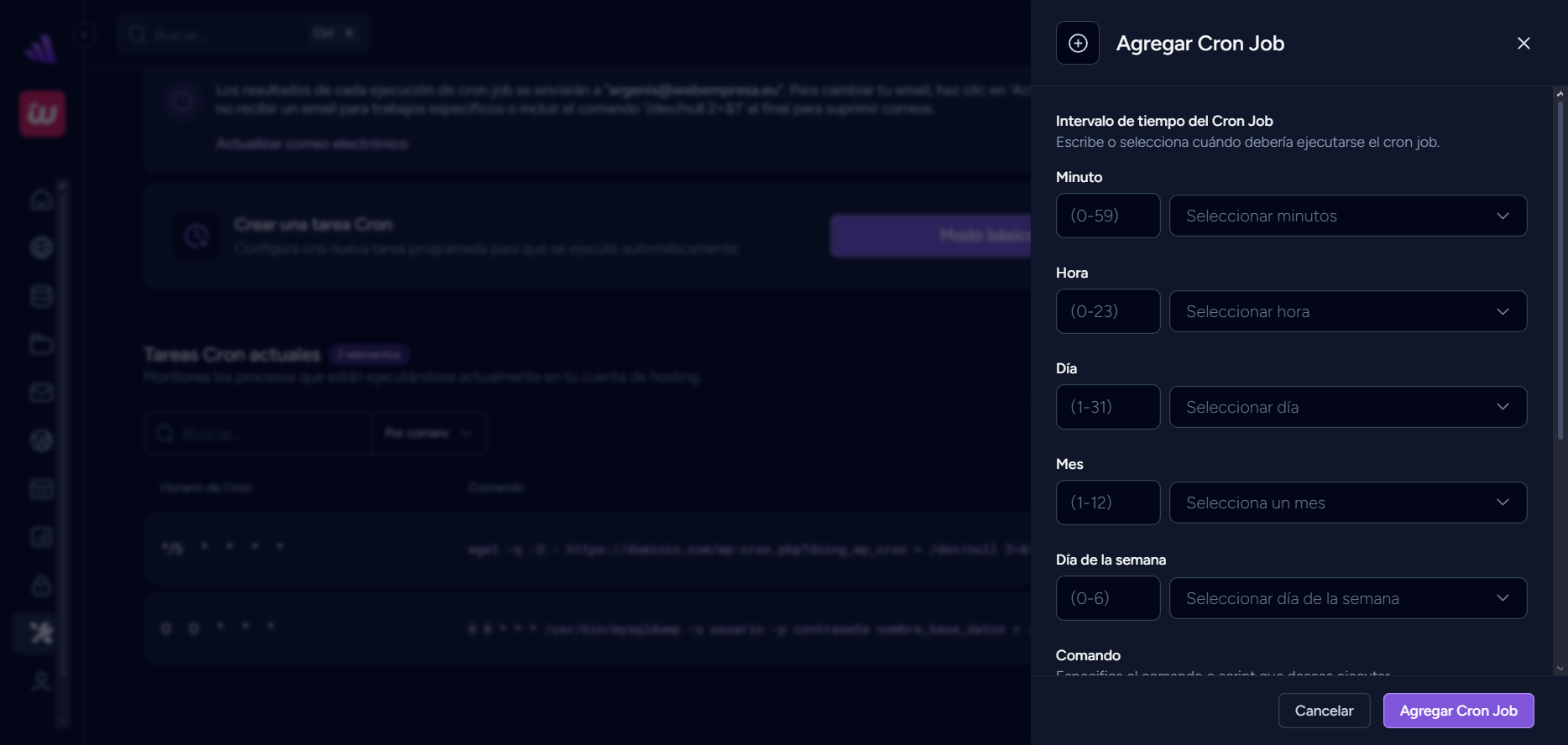 Las tareas Cron en WePanel nos permiten automatizar procesos en nuestro sitio web sin necesidad de intervención manual. Esto es en especial útil para ejecutar scripts de mantenimiento, enviar correos automáticos o actualizar ciertos elementos en WordPress.