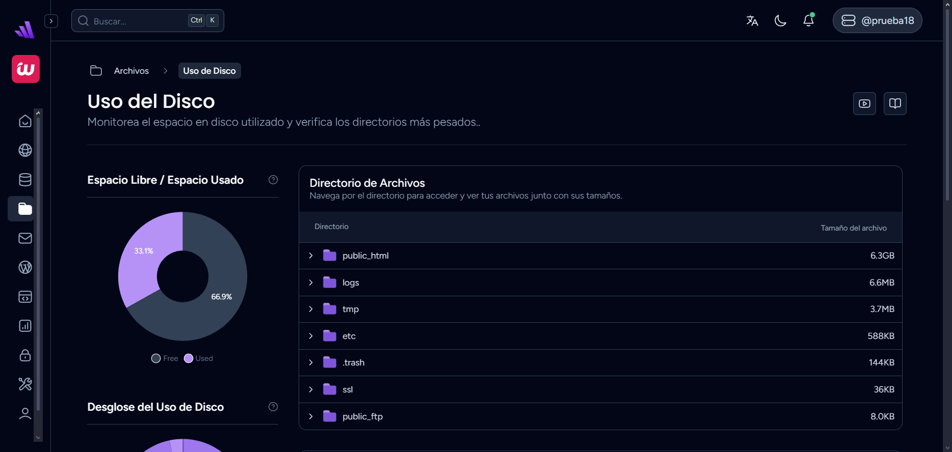 Esta es una de las herramientas más útiles que vamos a tener en nuestro nuevo WePanel, tendremos al alcance de pocos clics un sistema que nos indica cuanto espacio hay en nuestro disco, una forma similar a lo que sería conocer el espacio de nuestro teléfono pero aplicado a nuestro WePanel.