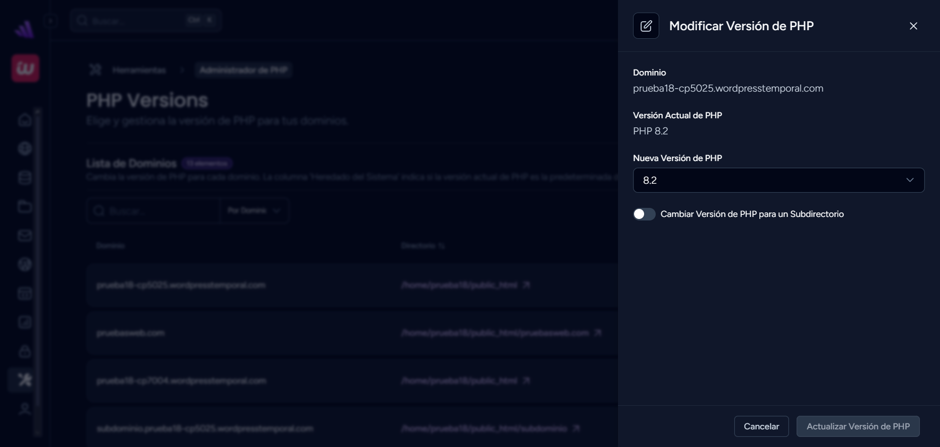 Por ejemplo, si necesitas cambiar la versión de PHP de una web, por requerimientos del núcleo de WordPress, de un plugin o para mejorar su rendimiento, verás en la siguiente animación que hacerlo es sencillo y rápido.