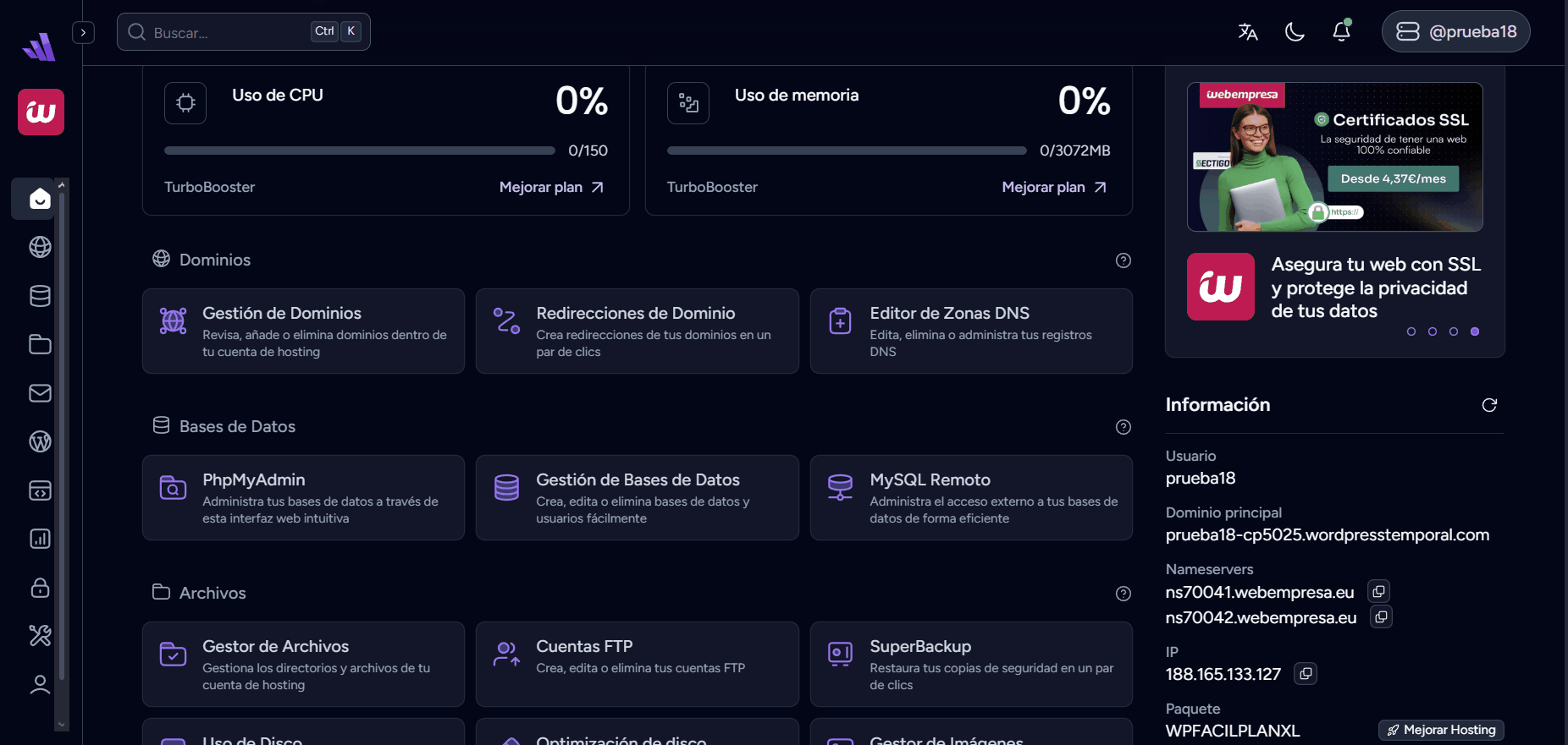 En WePanel, podemos instalar un certificado SSL gratuito como Let’s Encrypt o subir un certificado propio de pago para reforzar aún más la seguridad del sitio.